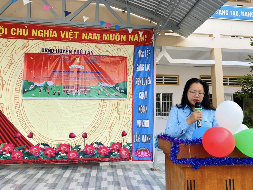 Đồng chí Nguyễn Phương Linh – Bí thư Huyện đoàn, Chủ tịch Hội đồng Đội huyện phát biểu khai mạc ngày hội “Thiếu nhi vui khỏe – Tiến bước lên Đoàn” tại Liên đội trường Tiểu học Rạch Chèo
